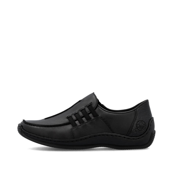 Rieker’s women’s shoes are an essential addition to your collection. Featuring elastic bands, they eliminate the need for laces or zippers, making them quick to slip on while ensuring a snug fit. The black upper stands out with a glossy patterned back and the brand logo, offering a unique look. Inside, a soft leather insole provides lasting comfort with every step. Perfect for daily wear, their versatile style pairs effortlessly with jeans, tailored pants, or skirts for a polished appearance.